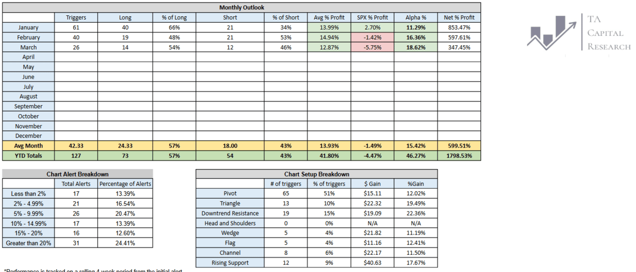 In addition to our Model Portfolio and consistent Research Reports, we provide our clients with daily Premium Watchlists — as well as chart alerts when these setups breakout. Attached is the YTD performance of our Premium Watchlist Chart Alerts through March 2025.